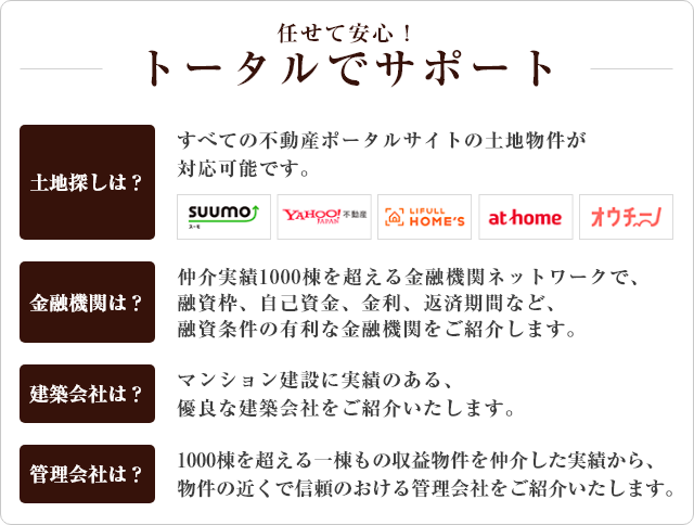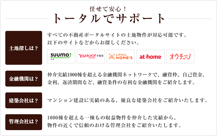 管理会社に至るまで、総合的にサポートいたします。