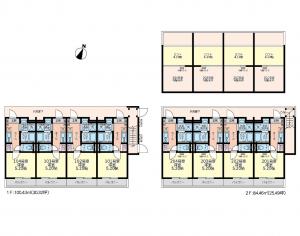 築33年 徒歩16分 仲介手数料20%割引 二棟一括 軽量鉄骨造2階建 1K14戸 バストイレ別 室内洗濯機置場 駐輪場 北側・西側公道面 満室